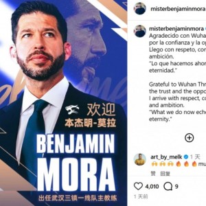 1月4日讯 正式出任三镇主帅职务后,本杰明·莫拉更新社媒,谈到了自己来到三镇执教的感受。本杰明·莫拉在社媒晒出了官宣照片...