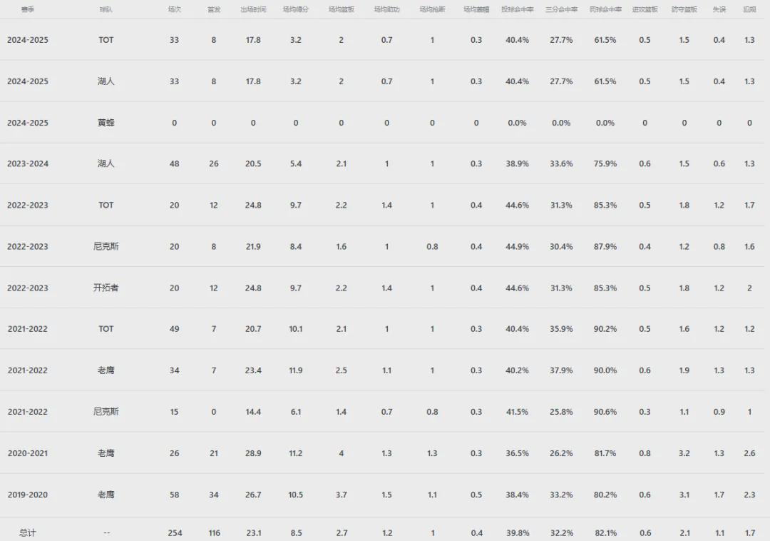 不过在23-24赛季,雷迪什帮助湖人夺得了NBA杯赛冠军,这也是他迄今为止的NBA生涯唯一的荣誉。