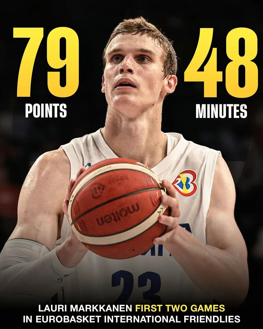 在最近两场对阵比利时的热身赛中,这位28岁的NBA球星彻底打疯了——首战24投17中,三分13中7,狂轰48分9篮板3抢断,带队105-62血洗对手;次战12投8中,三分6中4,再砍31分5篮板2助攻,帮助芬兰92-74轻松取胜。